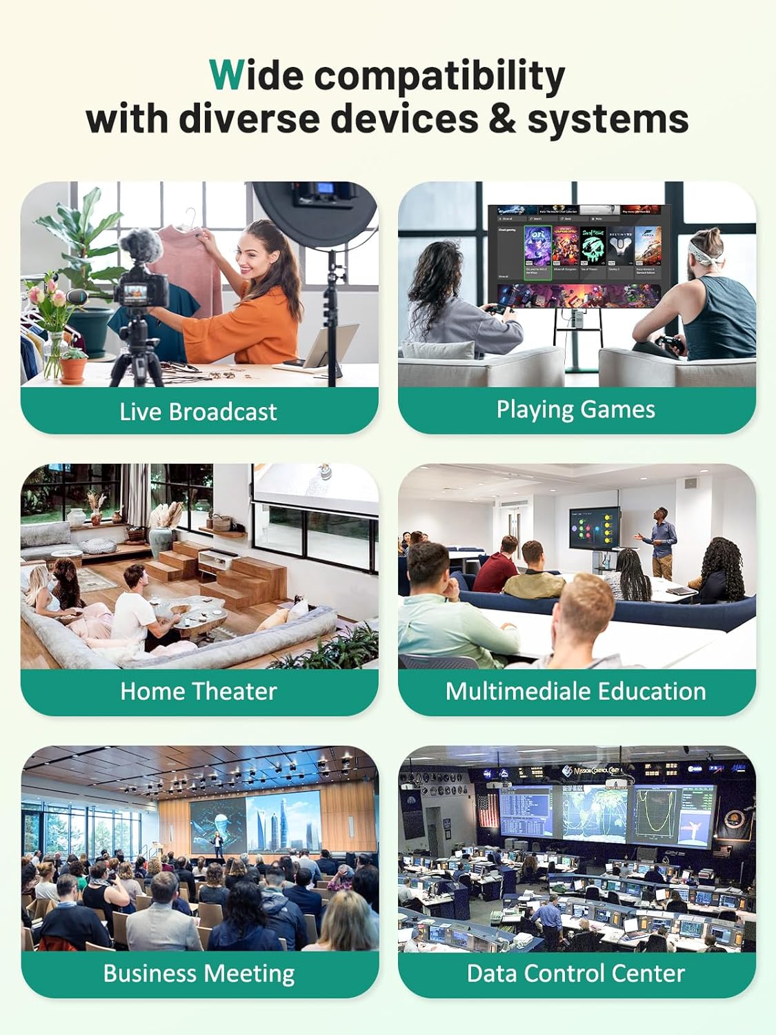 Support various systems: Mac OS, Windows, iPhone, iPad, Android, chrome, Linux…Support for various devices: Smart TVs (Samsung, LG, Sony, Vizio, TCL), Laptops (MacBook, Dell, HP, Lenovo, Asus, Acer), Gaming Consoles (Xbox One, PlayStation 4/5. Nintendo Switch), Blu-ray/DVD Players (Samsung, Sony, LG, Panasonic), Projectors (Epson, BenQ, Optoma, ViewSonic) ……Support for various streaming audio and video: Netflix, Amazon Prime Video, Disney+, Hulu, YouTube, HBO Max, Apple TV+, ESPN+, Twitch, Peacock….