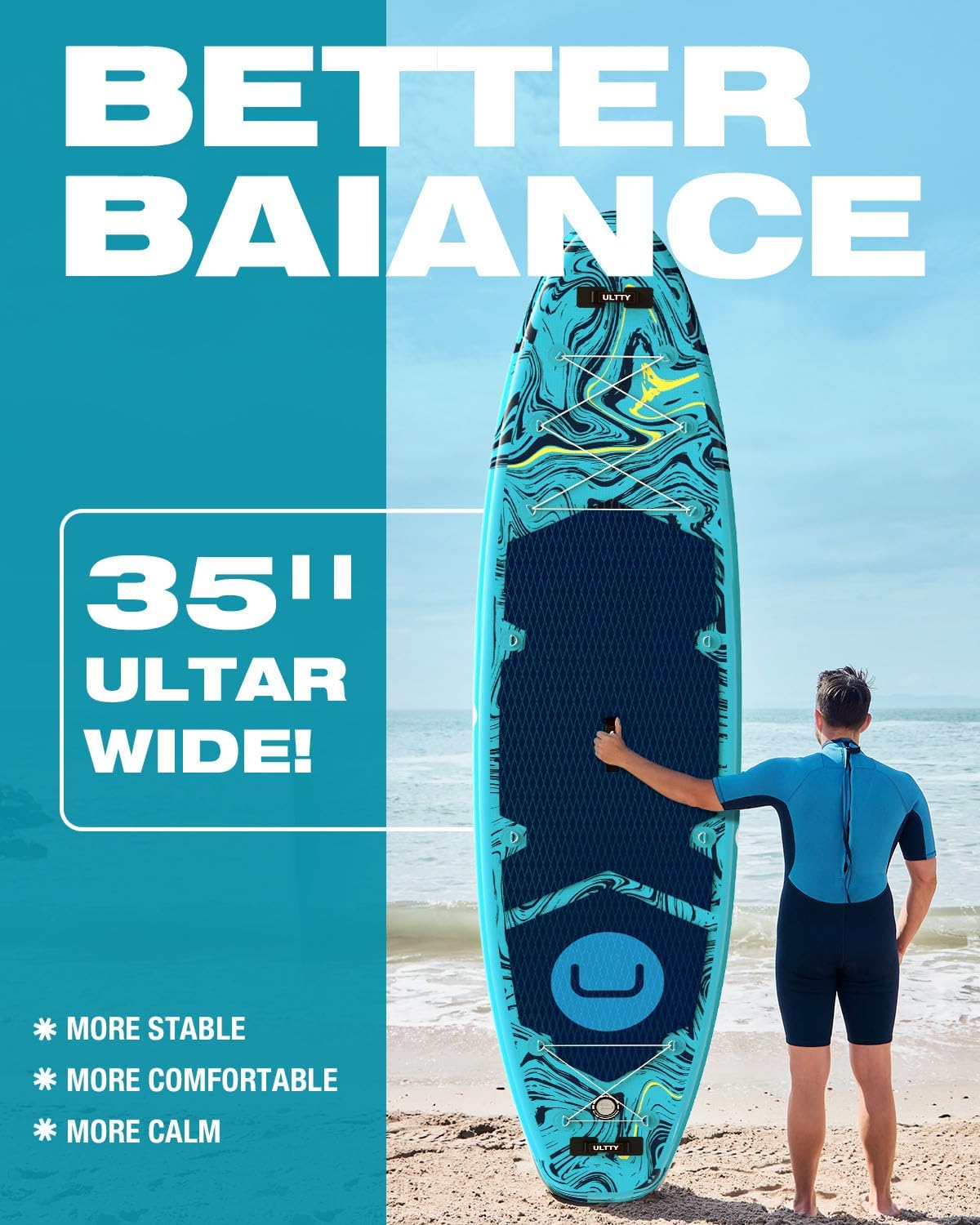 35‘’ SUPER WIDE & ULTRA STABLE: ULTTY 11’6″ paddleboard features a 35″ wide platform(compared to typical 32″ boards), making it ideal for beginners, families, and activities like yoga or simply relaxing. It also offers ample space for a child or pet to join the fun without compromising balance.