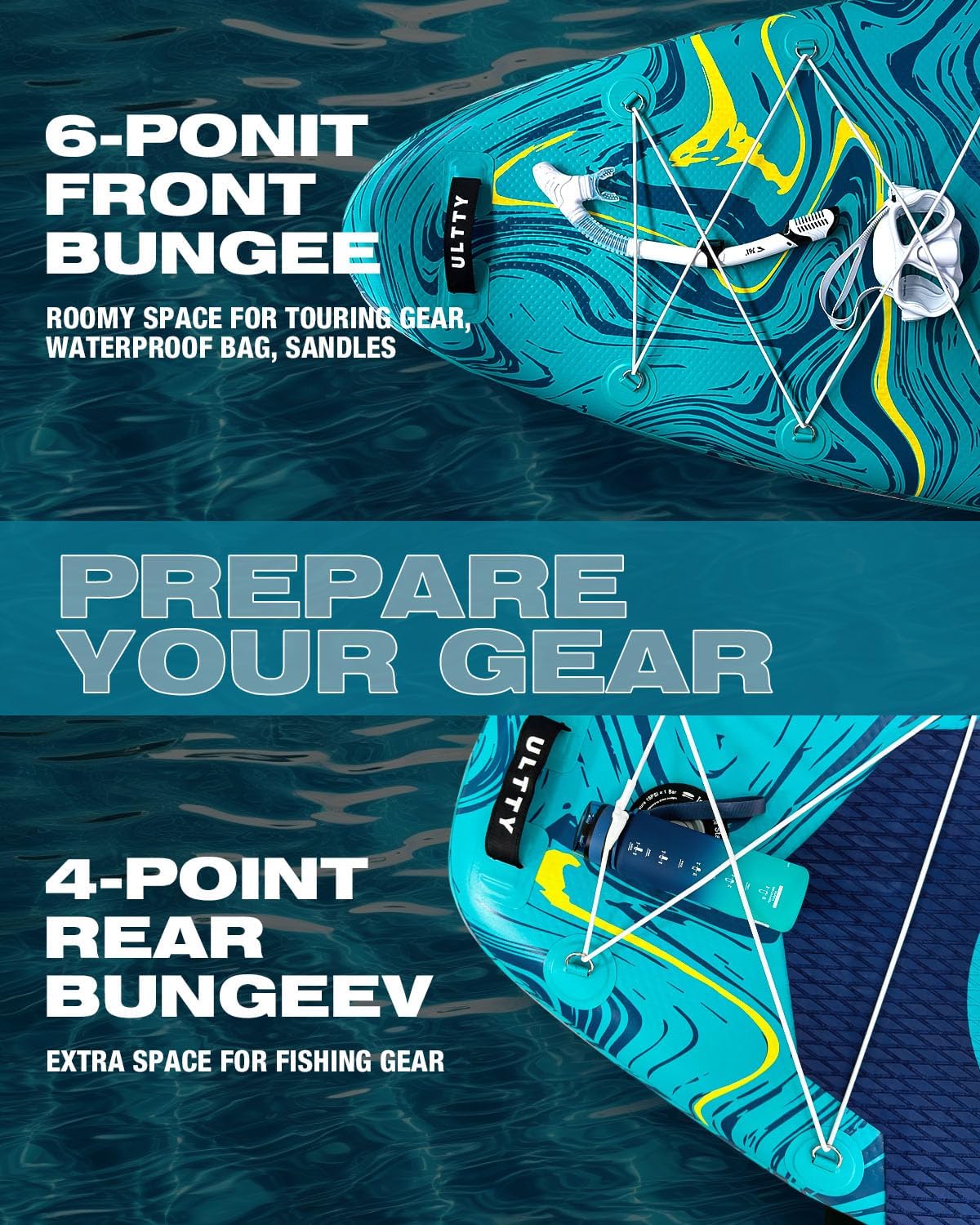 CARGO STORAGE WITH DUAL BUNGEE SYSTEM: ULTTY SUP board features a dual bungee system: a 6-point bungee at the front and a 4-point bungee at the rear, providing ample space for gear like dry bags, jackets, coolers, or fishing equipment. This system is ideal for keeping everything secure and easily accessible during fishing, long-distance paddling, or day trips.