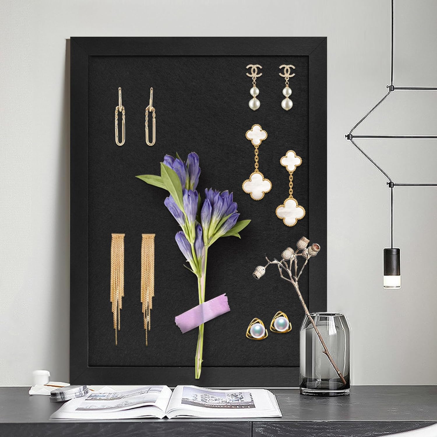 - Our vision board has a black felt surface and a black wood frame. It is easy to display your Jewelry, enamel pin collection, home or office messages, notes, memos, pictures, calendars, or announcements. You can fully show your unique taste and quality.