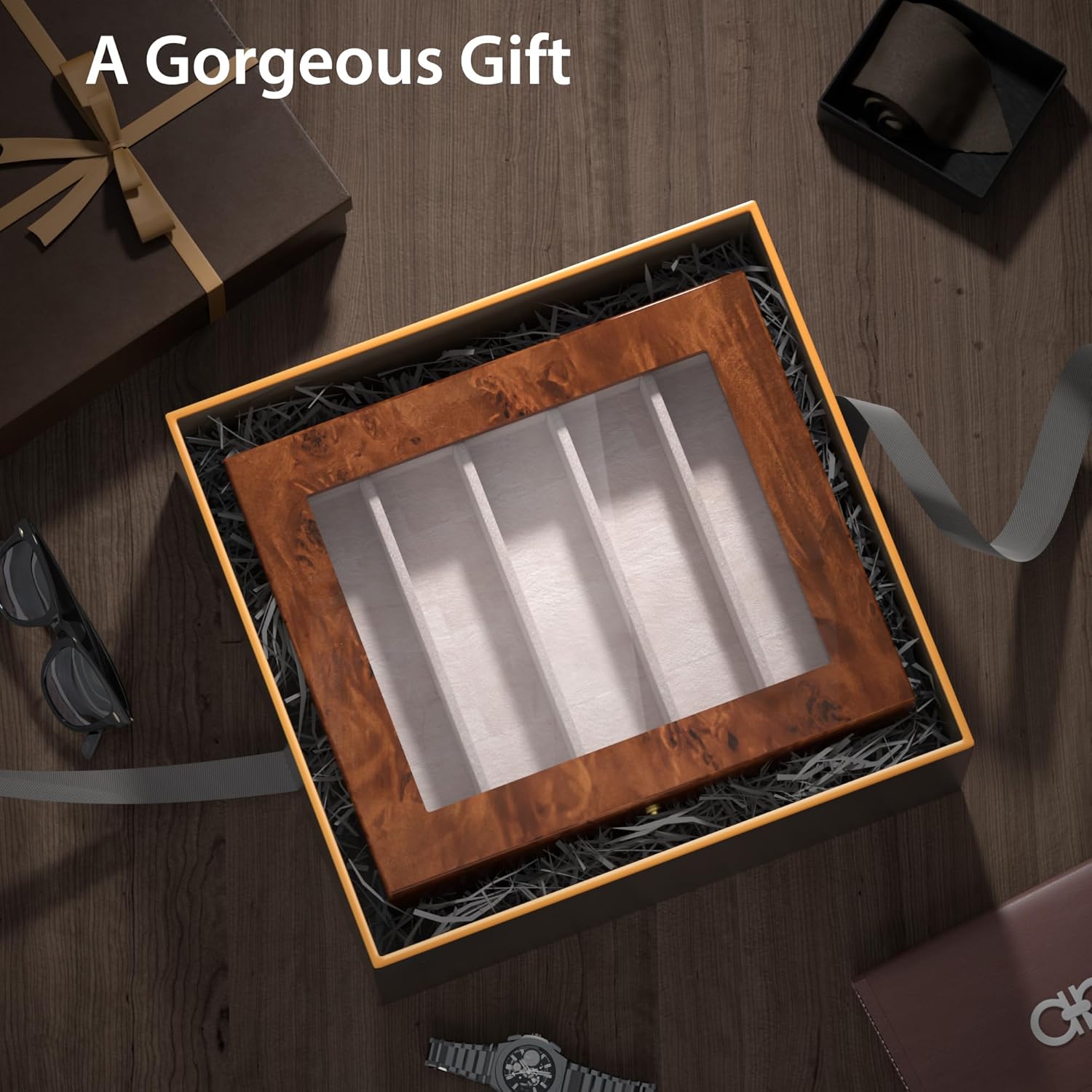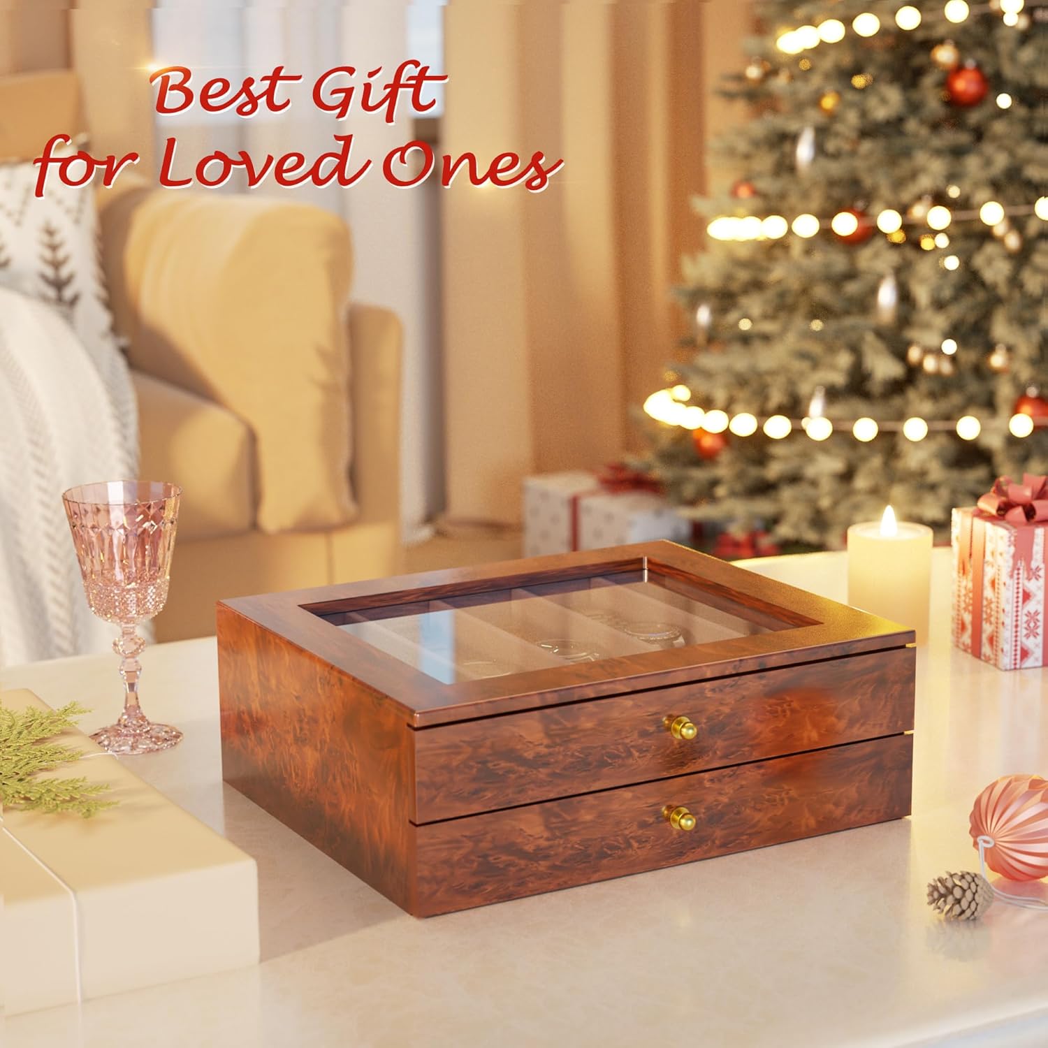 Quality Material and Generous Design:Crafted with sturdy premium MDF wood with high-gloss PU leather brown Burlwood texture, interior is covered with soft velvet lining to offers protection for your watches from accidents and scratches. Bottom is anti-slip velvet to keep stable.
