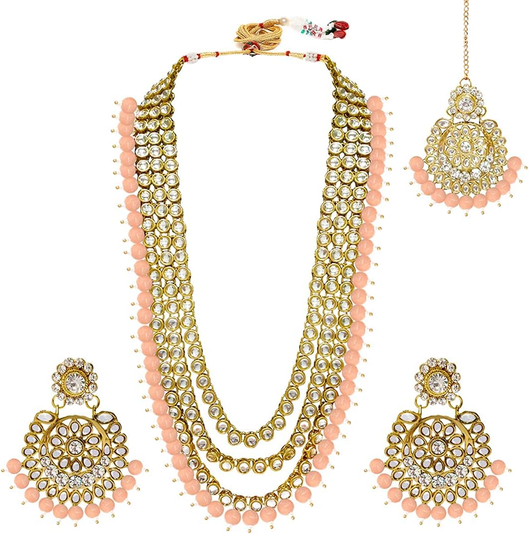 Aheli Indian Ethnic Wedding Faux Kundan Beaded Bridal Long Necklace Earrings with Maang Tikka Traditional Jewellery Set Gift for Women
