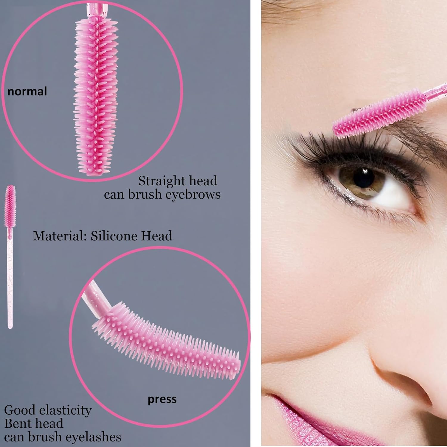 Material: eyebrow mascara brush is constructed of hard plastic handle and safe silicone head, elastic brush head can be bend slightly according to your need . Suitable for false eyelashes, thick eyelashes, detail hair, and eyebrows,non-stick mascara.