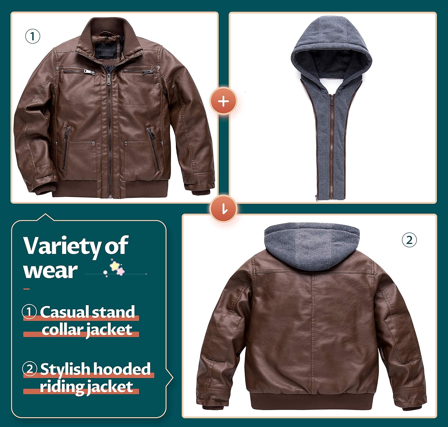 Warm & Waterproof fabric–Durable faux leather jacket is made of PU overlays for water-repellent durability, matched with soft cotton quilted lining for freezing cold winter.2 style design–Kids bomber leather jacket with removable Hooded design for different looks between stylish hooded riding jacket and casual stand collar winter jacket.Full zip front closure, warm and convenient for kids.Windproof details–Kids motorcycle jacket with thick lining, excellent seam, elastic rib cuff and hem is comfortable and can keep naughty boy warm when playing outside. High quality leather without bad smell, soft and solid, is resistance to dirt and easy to wash.Practical multi-pockets–Waterproof spring pleather jacket with 2 zippered hand pockets, 2 zippered chest pockets, 1 internal pocket, great for keeping keys, wallet & small items.Classic hoodie jacket–Children winter coat with the full zip front closure and cool stand up collar design, it helps lock in temperature and windproof.