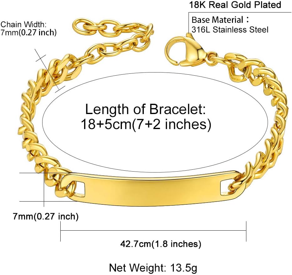 ChainsHouse Personalized ID Bracelet for Men Women Stainless Steel Cuban Curb Link Chain Custom Engrave Bar Bracelet Bangle, 7mm Width, 19-21CM, Send Gift Box