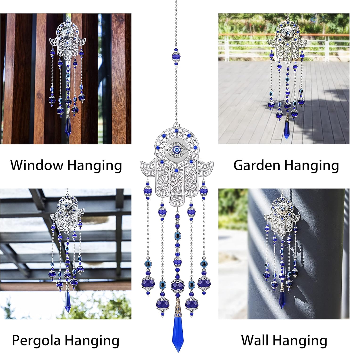 SIZE:17L*3W inch.This hanging crystal pendant is consist of metal alloy Hamsa hand charm,Turkey/Greek evil eye amulets,sapphire crystal beads and suncatcher prism