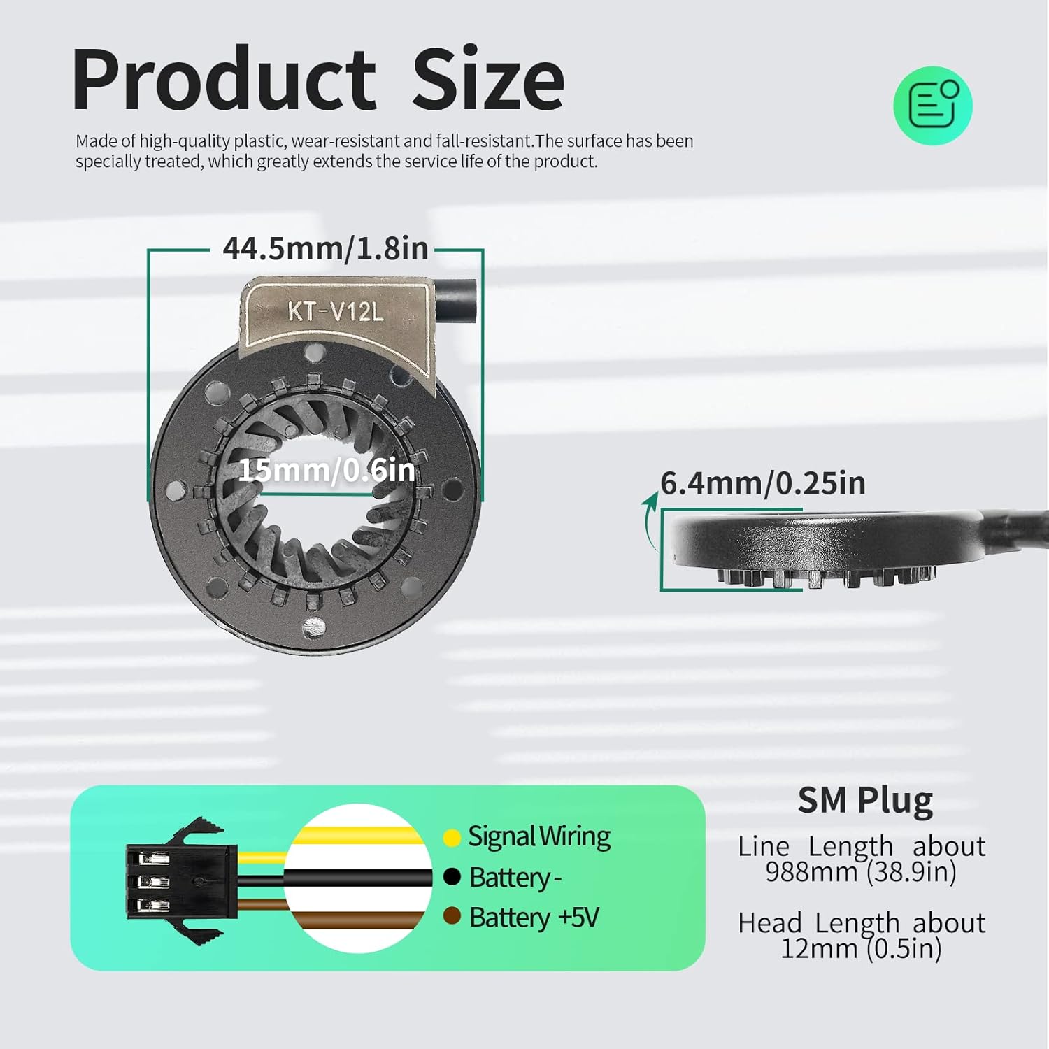 Model:This is the V12-L PAS model from KT brand, installed on the left side, using dual Hall detection components, with high sensing sensitivity and stable signal. 12 signal output, fast auxiliary response, and can automatically recognize the forward and reverse directions of the pedal