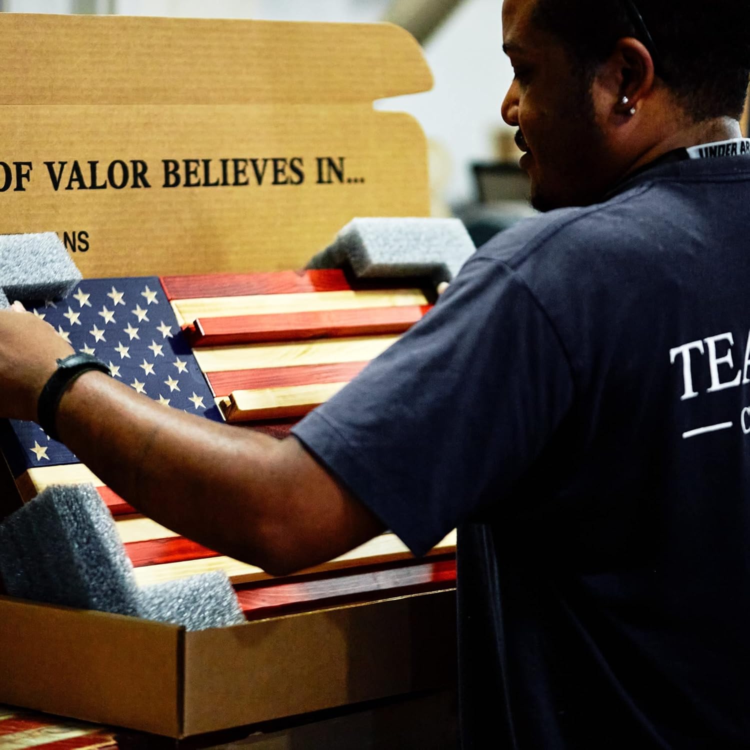 The back of each high-quality, patriotic piece is signed by the Veteran who made it. Veteran Owned. Veteran Operated. Veteran Made, 100% in the USA.