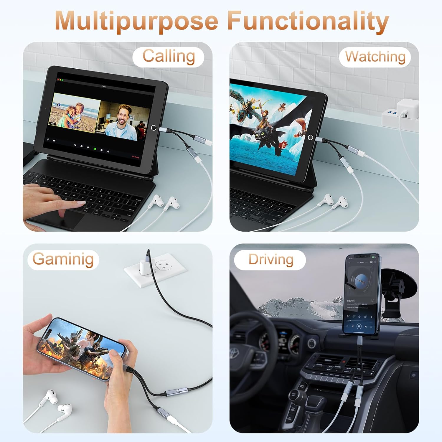 【2 in1 Function 】The lightning to 2 lightning iphone charger and headphones adapter has multiple functions. Aux Headphone Jack Audio + Charging Adapter + Phone Call + Music Control+ Mic – It has 2 ports, one for charging and the other for audio. Charging and listening to music at the same time. Dual Lightning headphone and charger adapter means you can listen to music,play games, calling or watch videos while fast-charging your devices.