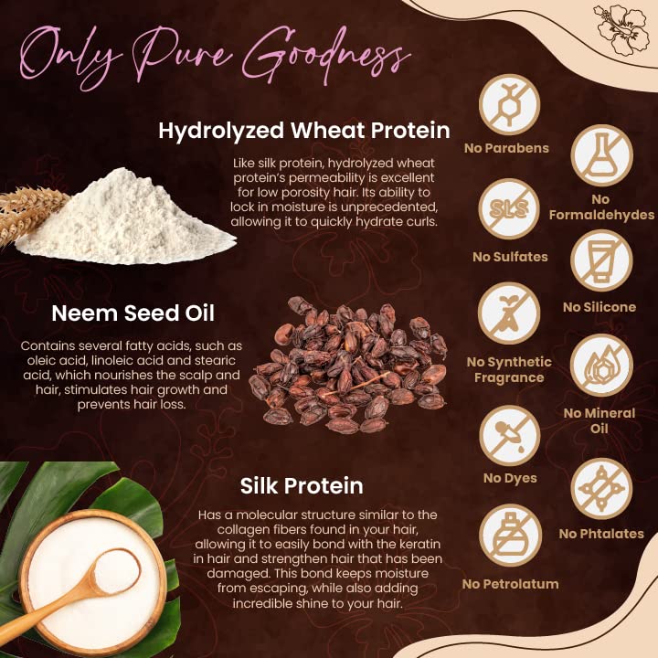 PACKED WITH PURE, NATURAL INGREDIENTS, like Silk Protein, Hydrolyzed Wheat Protein, and Neem Seed Oil, which contain fatty acids and other nutrients to nourish scalp, lock in moisture and protect hair. Great for low porosity hair, like curly hair.
