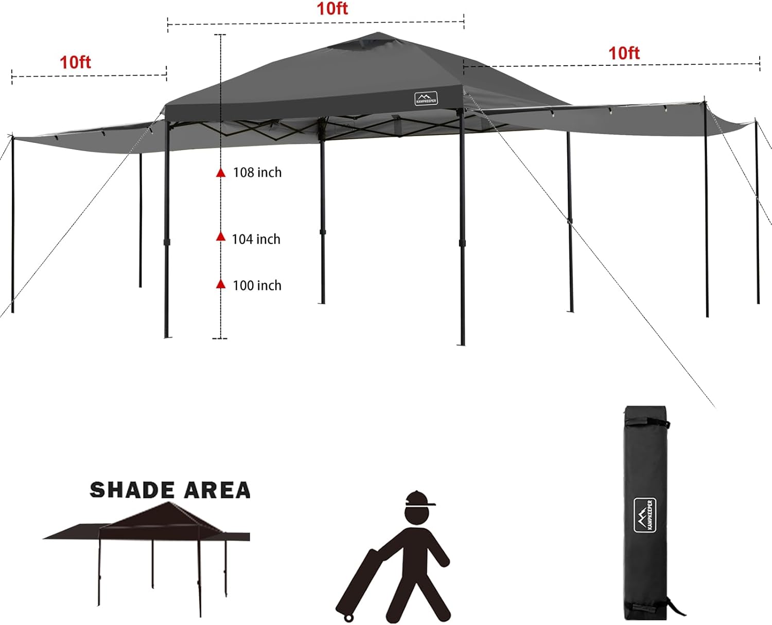 This outdoor shade instant canopy tent offers up to 300 sq. ft. of coverage, perfect for camping, beach trips, sporting events, business booths, or backyard gatherings. The included two detachable shelters can be set up to transform the tent into a 10x20FT or even a 10x30FT gazebo, giving you ultimate flexibility for any event