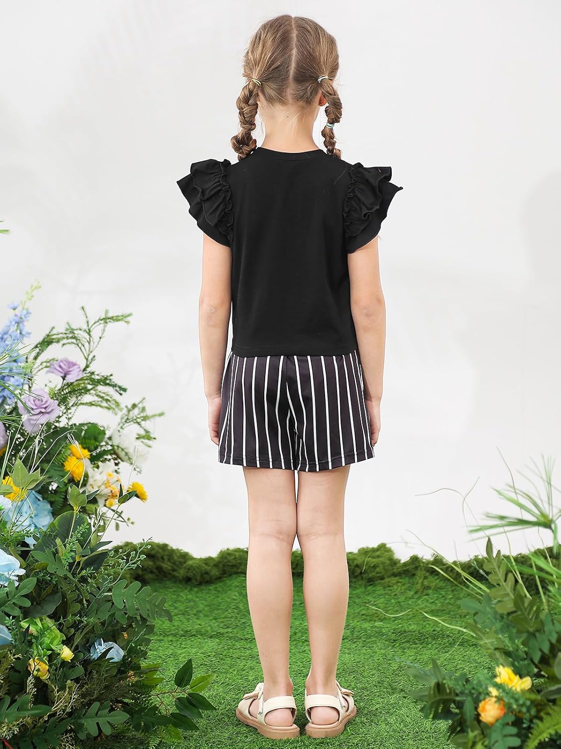 Kids4ever Girls 2Pcs Outfits For 5-12Y Ruffle Short Sleeve Tie Knot Front Top And Shorts Set For Kids School