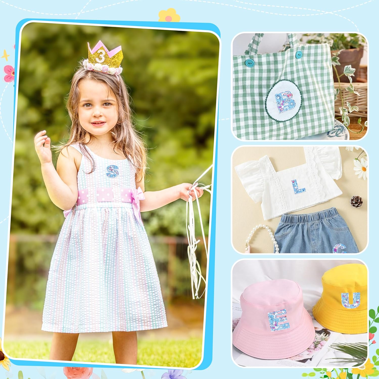 DIY Enthusiasts and Personalizers: Perfect for kids, girls, mama, DIY enthusiasts, and families—including teachers, daughters, mothers, and wives—these letter appliques for fabric are ideal for personalizing dresses,skirts,tote bag,socks,bandana bib,pillows and more. They offer creative expression on clothing, accessories, and beyond. Use them to decorate notebooks, pencil cases, phone cases, wallets, or even baby room and party decor items like birthday banner,cushions and curtains