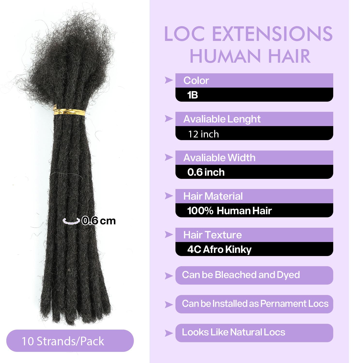 Loc Extensions Human Hair Dreadlock Extensions Human Hair 0.6CM Width Locs Extensions Bundles for Women Men Kids Full Handmade Permanent Locs Can Be Dyed and Bleached 10Strands(1B,12 Inch)