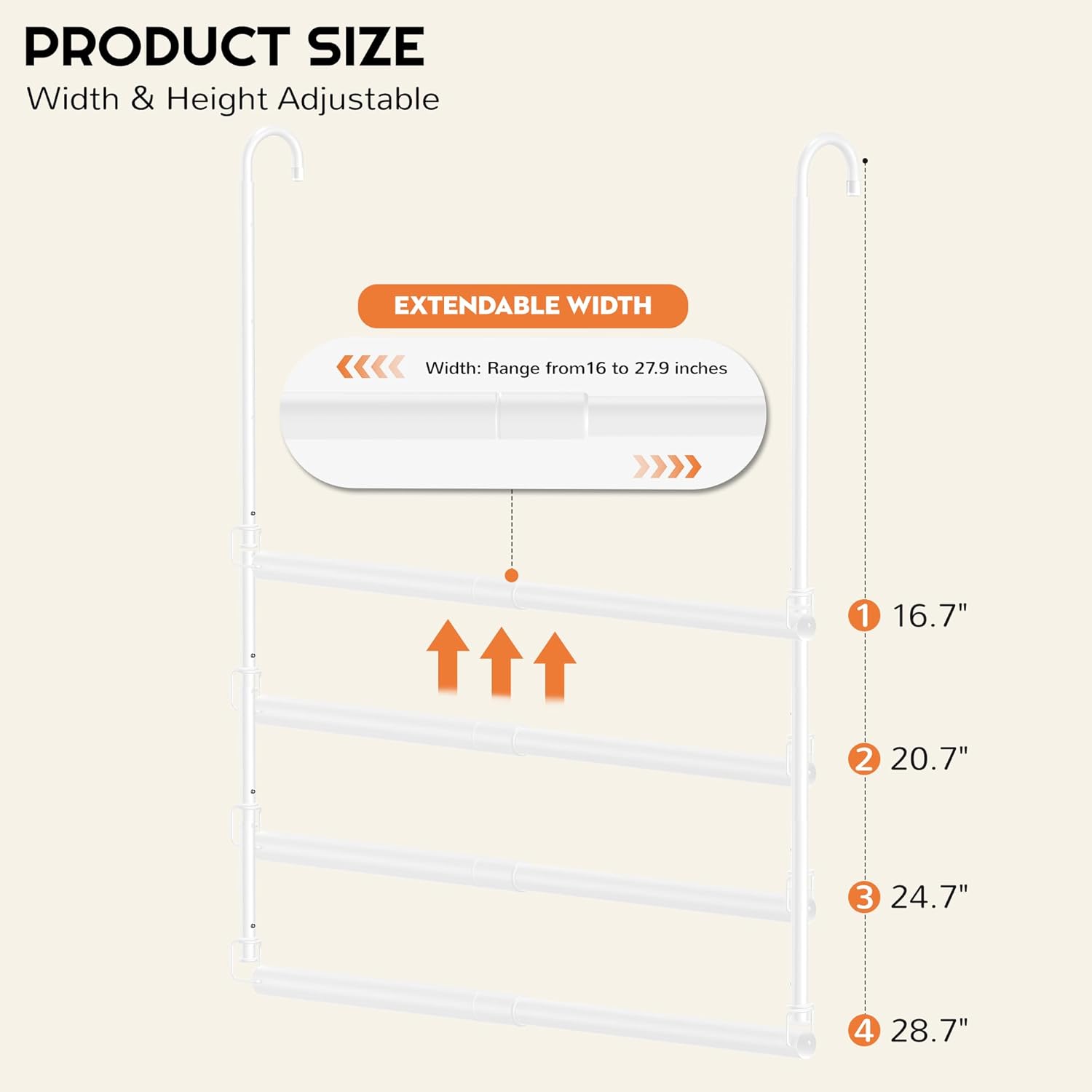 【Upgrade Adjustable Width Height Closet Extender Hanging Rod 】This closet rod features an adjustable width from 17 to 29 inches and a height range from 14.6 to 37.1 inches. With six different height settings, it maximizes the unused space beneath hanging clothes. Fully expanded, it measures 37.1 inches in height and 29 inches in width, making it perfect for optimizing your closet storage.