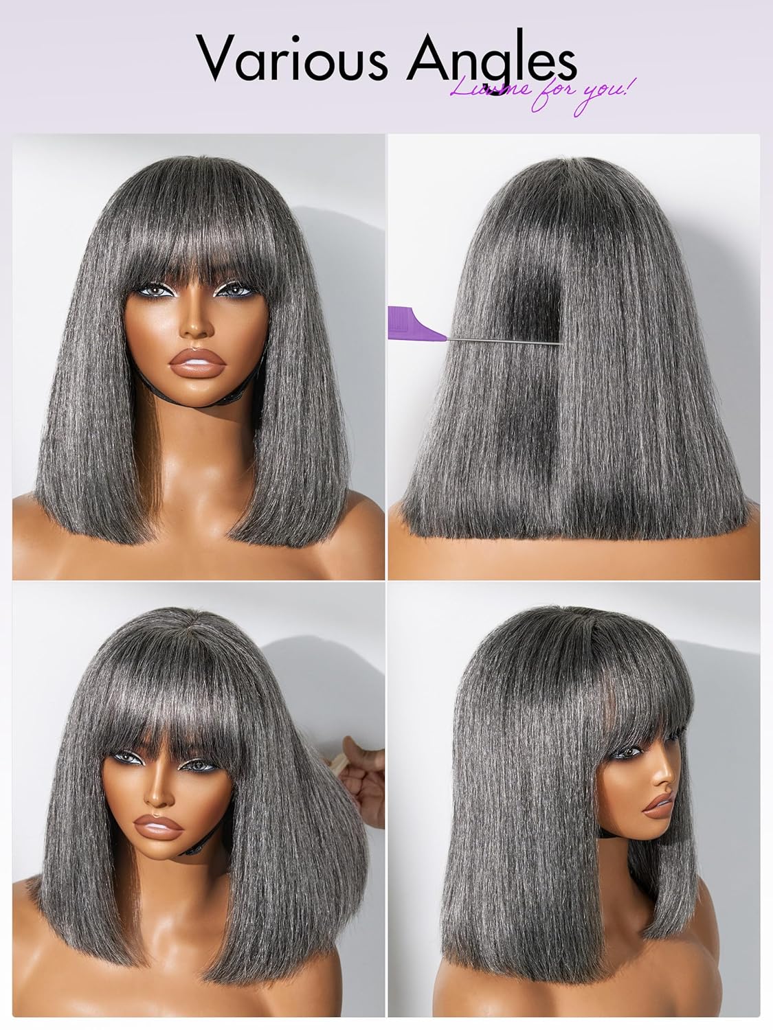 LUVME HAIR All-Day Comfort Wig 12 Inch Grey Salt & Pepper Silky Straight Bob Wig with Bangs Human Hair Glueless HD Lace Bob Wig with Mix Grey Color, Ready to Go Short Wigs For Women