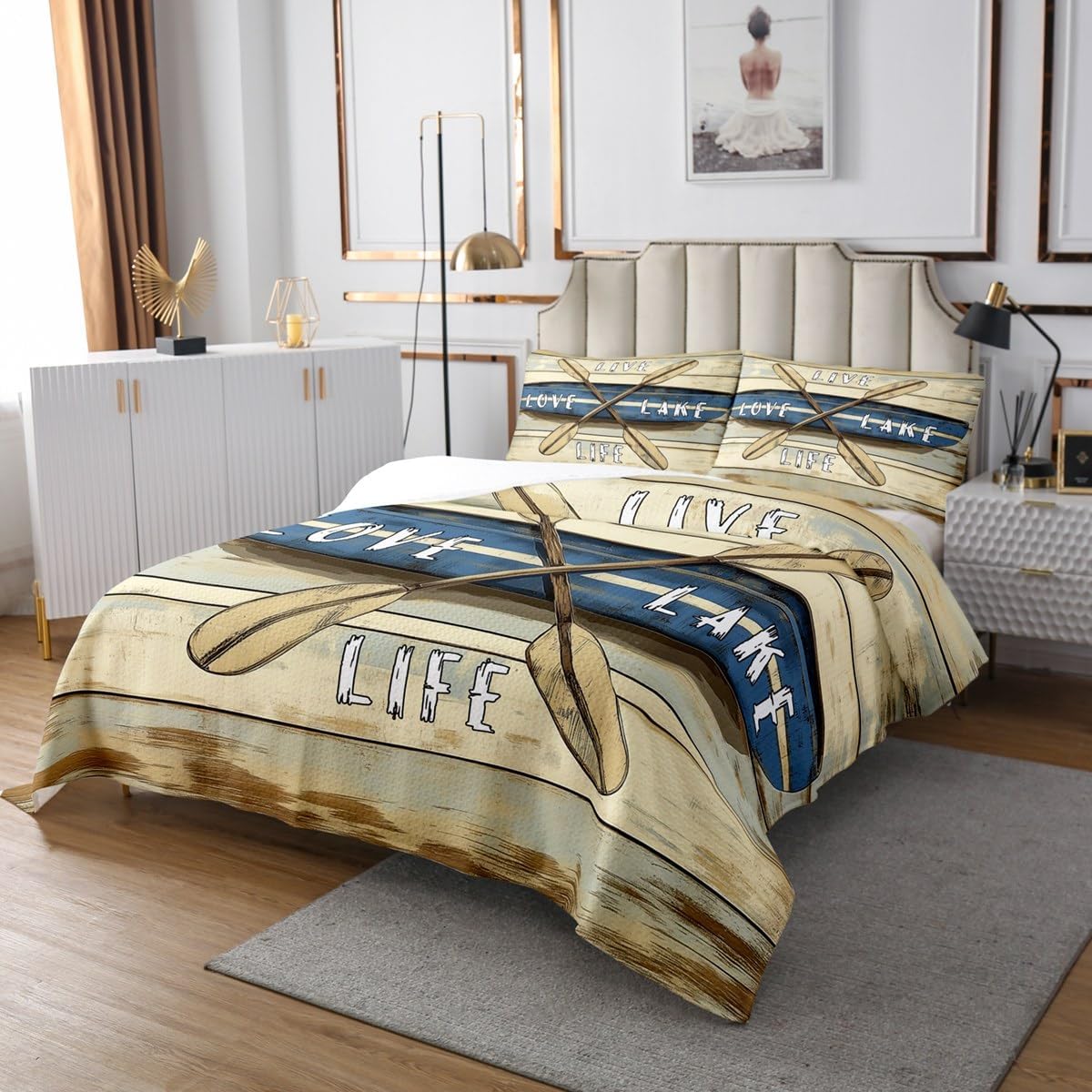 Manfei Lake Quilt Bedding Set Queen,Lakeside Surfboard Paddle Coverlet Bedspread,Retro Wooden Stripes Lightweight Bedding Bed Cover for All Season, Bedspread Set (1 Quilt+ 2 Shams)