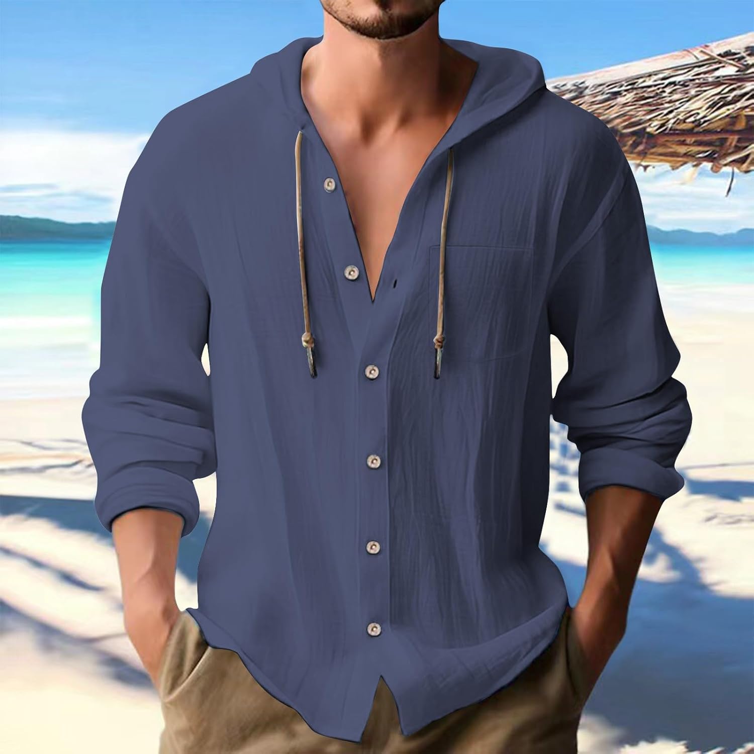Men’s Spring Summer Linen Hoodie Casual Solid Color Long Sleeve Shirts Comfy Button Down Loose Hooded Top Lightweight