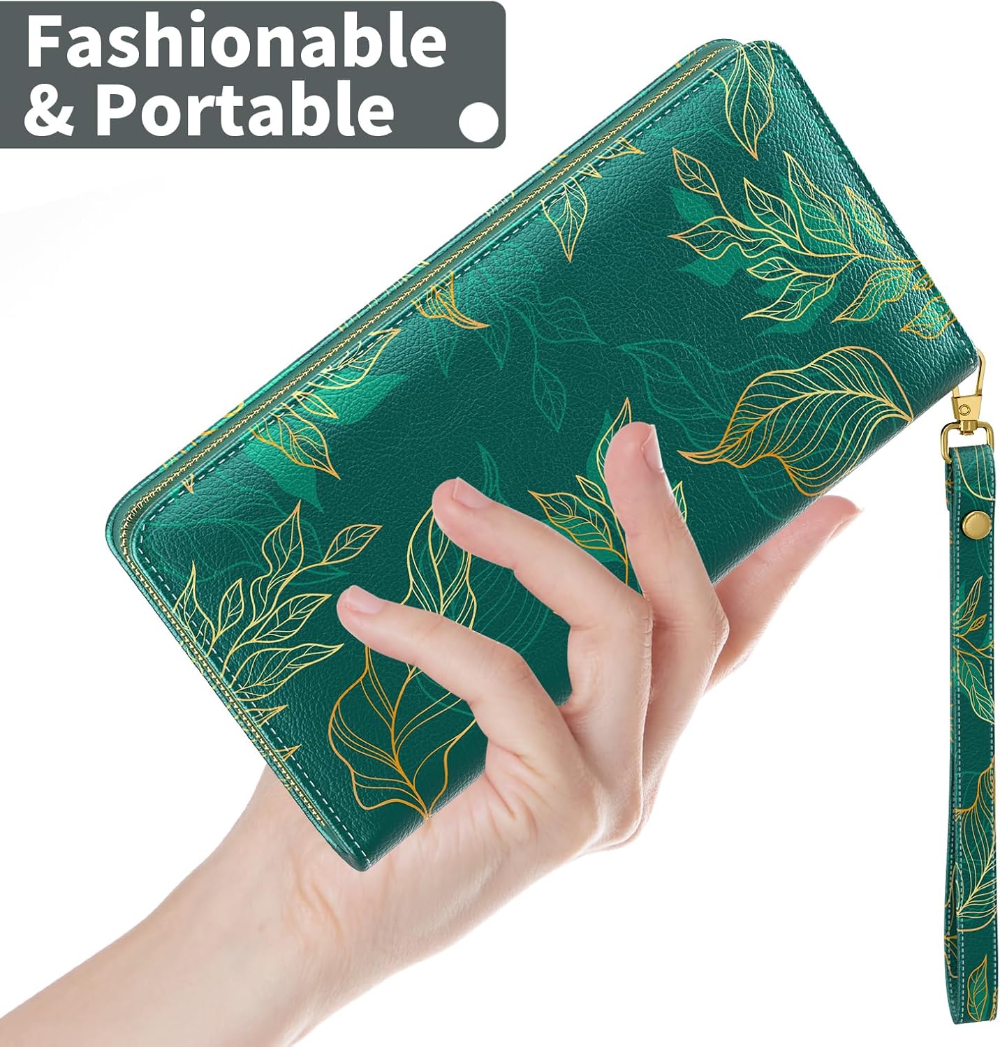 Nipichsha Womens Wallet, RFID Wristlet Wallet for Women, Cute Ladies Purse, Large Credit Card Clutch Wallets, Leather Card Holder Wallets with Zipper & Phone Holder, Luxury Green Leaf