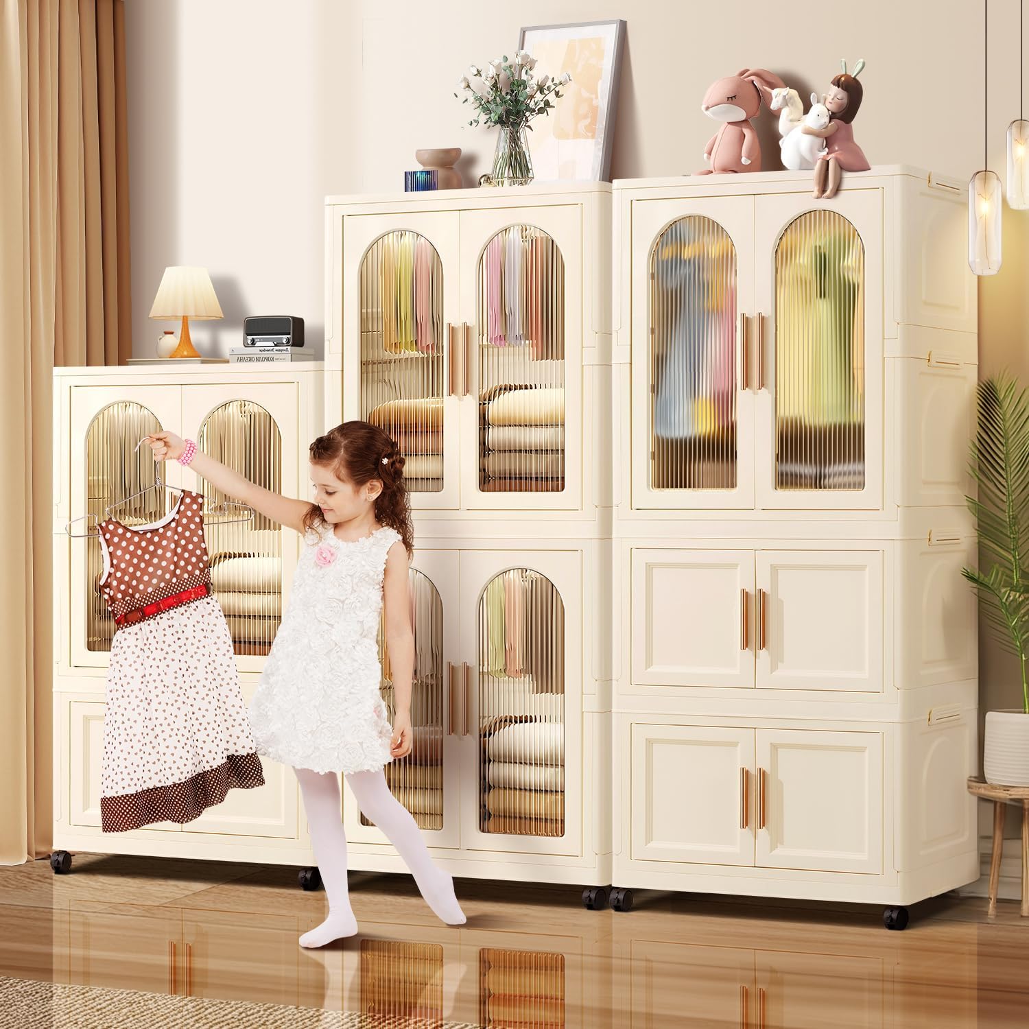 Portable And Durable: Closet for kids is made of plastic(PP+ABS). The buckles on the side can be buckled more firmly when stacking clothes shelving, and the portable closet will not be easily tipped and slipped. Transparent visible double doors, comfortable handle and wheel design make the kids dress up rack easier to move and clean in the bedroom, creating a modern and stylish children’s room, daughters room