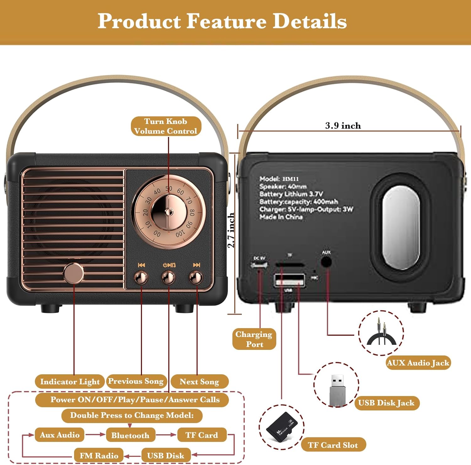 Retro Radio Bluetooth Speaker — To activate the FM radio feature, quickly double-press the power button of the cute speaker and ensure the provided AUX cable is connected for optimal channel reception. The cute bluetooth speaker with integrated radio function give you several different ways to relax. (※Note: You need to connect the AUX cable as an antenna for the FM radio model.)