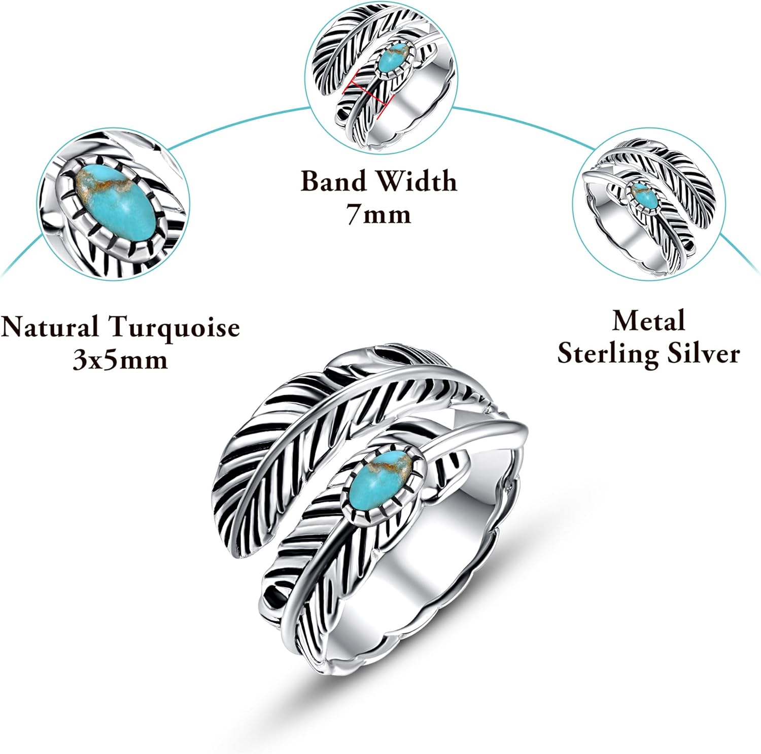 Be the first to review “Sterling Silver Feather Ring with Black Onyx & Turquoise – Adjustable Stacking Vintage Statement Ring for Women & Men”