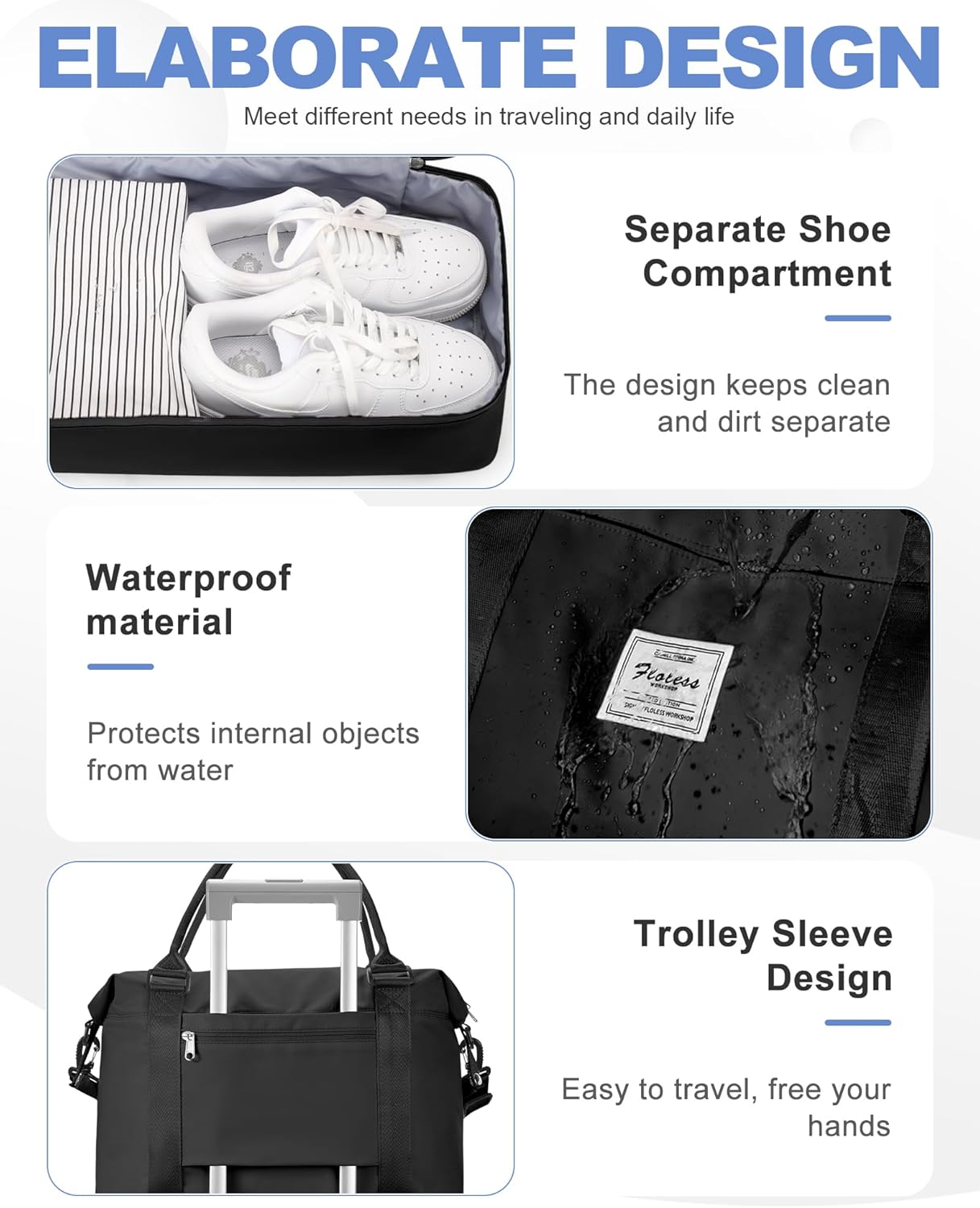 【VERSATILE STYLE】-Perfect for travel,overnight stays,weekend trips,business trips,gym,sports activity,or other daily use. Suitable for gym sport bag, carry on bag,travel bag,duffel bag, weekender bag,overnight bag,personal item bag,etc
