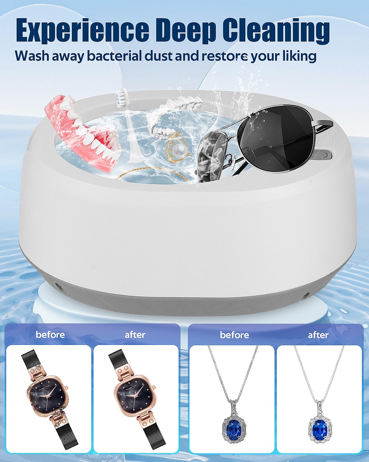 【Multi-functional Cleaning】: The Ultrasonic Cleaner can be applied to glasses, dentures, jewelry, tooth retainer and a range of products.