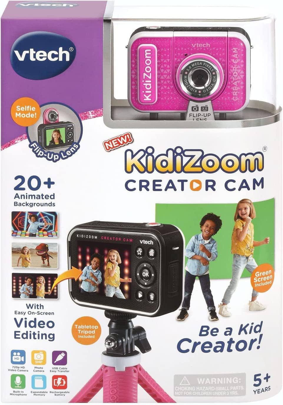 Be a kid creator with the KidiZoom Creator Cam digital kids camera! Create awesome videos with this high-definition kids camcorder and upload safely to any computer through a USB connection. Use the included green screen and 20+ animated backgrounds to get chased by a T-Rex, go to outer space or make yourself disappear! Use the tripod or selfie stick with the built-in microphone to set up your shot. Then, try the easy on-screen editing and creativity tools to create trick shots and time-lapse videos. The Creator Cam kids cameras are intended for ages 5–10 years. Video can only be uploaded via included USB cable at an adult’s discretion. Green screen required for some special effects. This cutting-edge video camera includes a microSD card slot to increase camera storage up to 32 GB (card not included). The high-tech toy video camera kids will love. Requires 3.7-volt lithium ion battery, included. Recharge the batteries with included USB cable. Dimensions: 2.4″ width x 3.6″ height x 1.5″ depth.