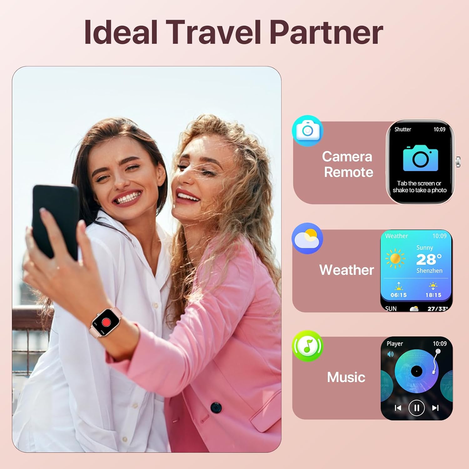【More Convenient Functions】 – Wanna go out? Raise your wrist, and check the smartwatch to know the weather. Switch the music you like on your smartwatches during the trip. Open the remote camera and shake your wrist to take a selfie without help. Set an alarm on your smart watch at night and be ready for the next wonderful day!