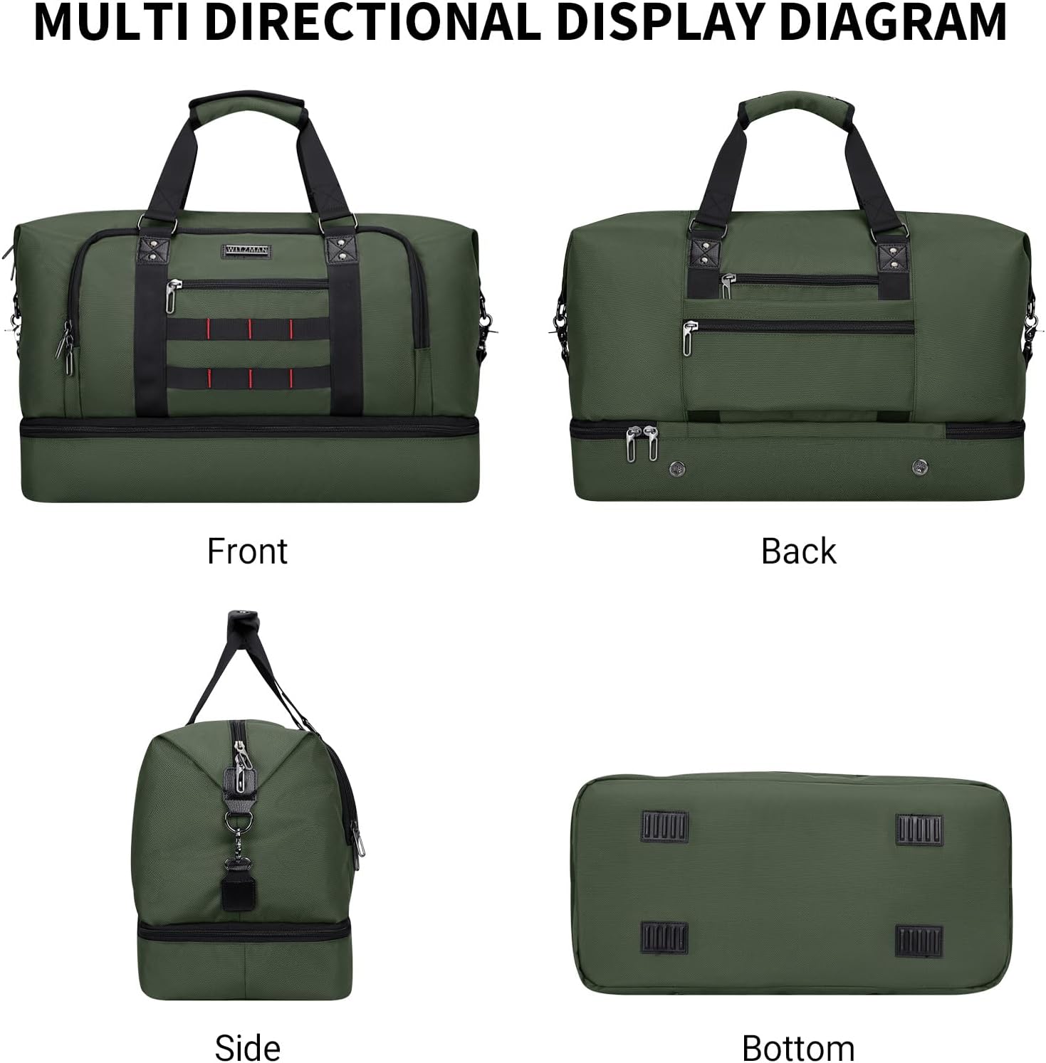 Separate Shoes Compartment:This weekender bag bottom has a independent shoe cabin, which can accommodate 1-2 pairs of men shoes or dirty clothes and the air vents to disperse the bad smell. It can help you avoid dirtying other clothes when packing, also provide more convenience for your travel.