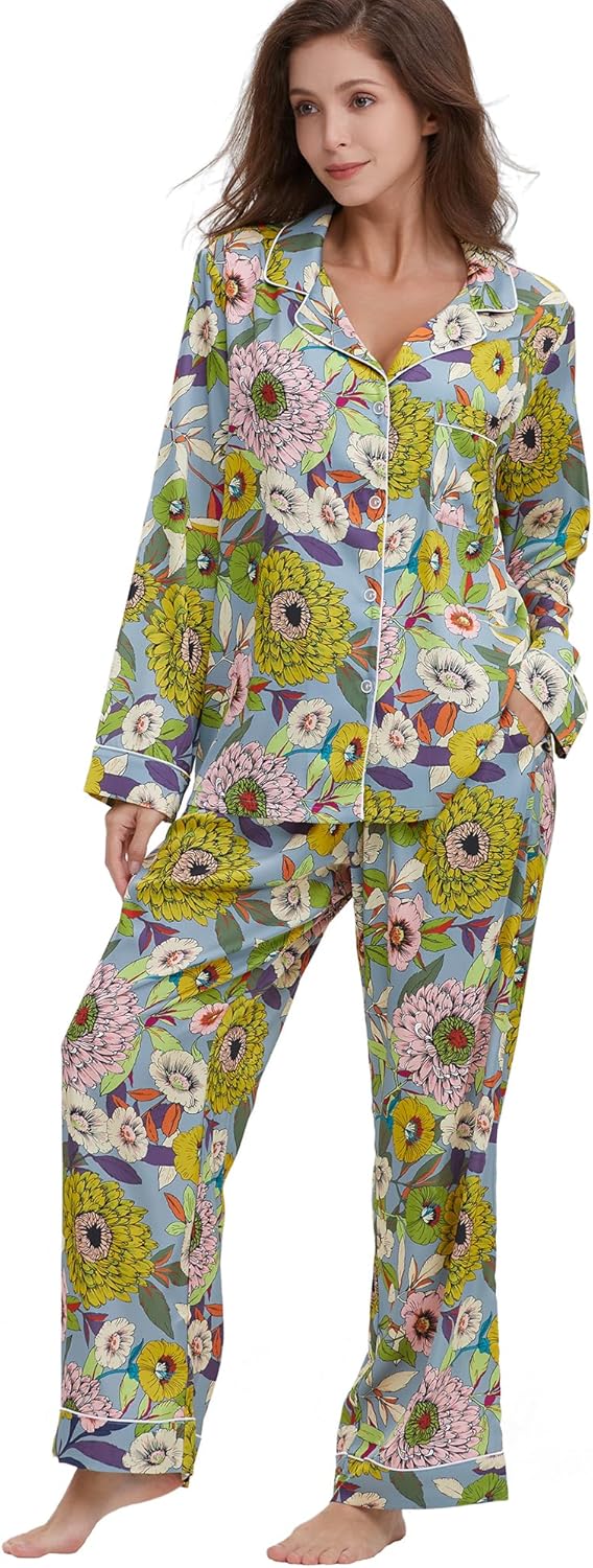 Womens Silk Satin Pajamas Set Button Down 2 Piece Pjs Long Sleeve Oversized Sleepwear with Pockets